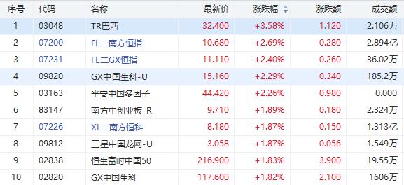 受市场消息影响,今日港股涨幅居前的ETF主要有南方两倍看多恒指,涨2.69%,成交额2.89亿港元;南方两倍做多恒科涨1.87%,成交额1.31亿港元。