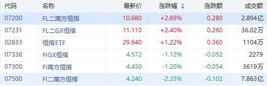 看多恒指相关ETF走强,南方两倍看多恒指(07200.HK)涨2.69%,成交额2.89亿港元。
