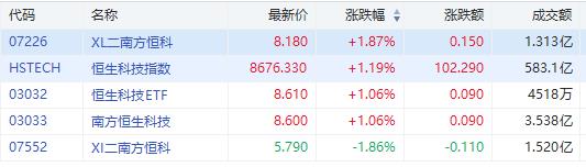 今日恒生科技指数涨1.06%。其中,南方两倍做多恒科(07226.HK)涨1.87%,成交额1.31亿港元;南方两倍做空恒科跌1.86%,成交额1.52亿港元。