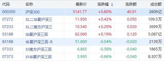 沪深300指数涨0.8%。其中,华夏沪深三百ETF涨0.19%,成交额5.01亿港元;南方两倍做多沪深三百ETF涨0.29%,成交额3699万港元。