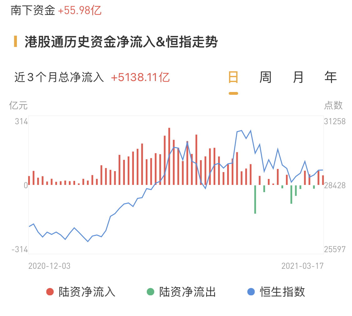 南下资金今日净流入港股55.98亿港元,周三净流入超43亿港元。