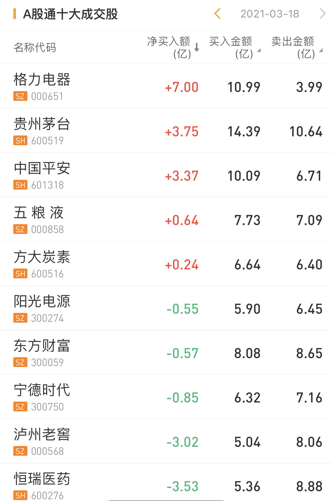 北上资金今日净买入格力电器7.00亿元,为今日买入之最。此外,贵州茅台也获净买入达3.75亿元。