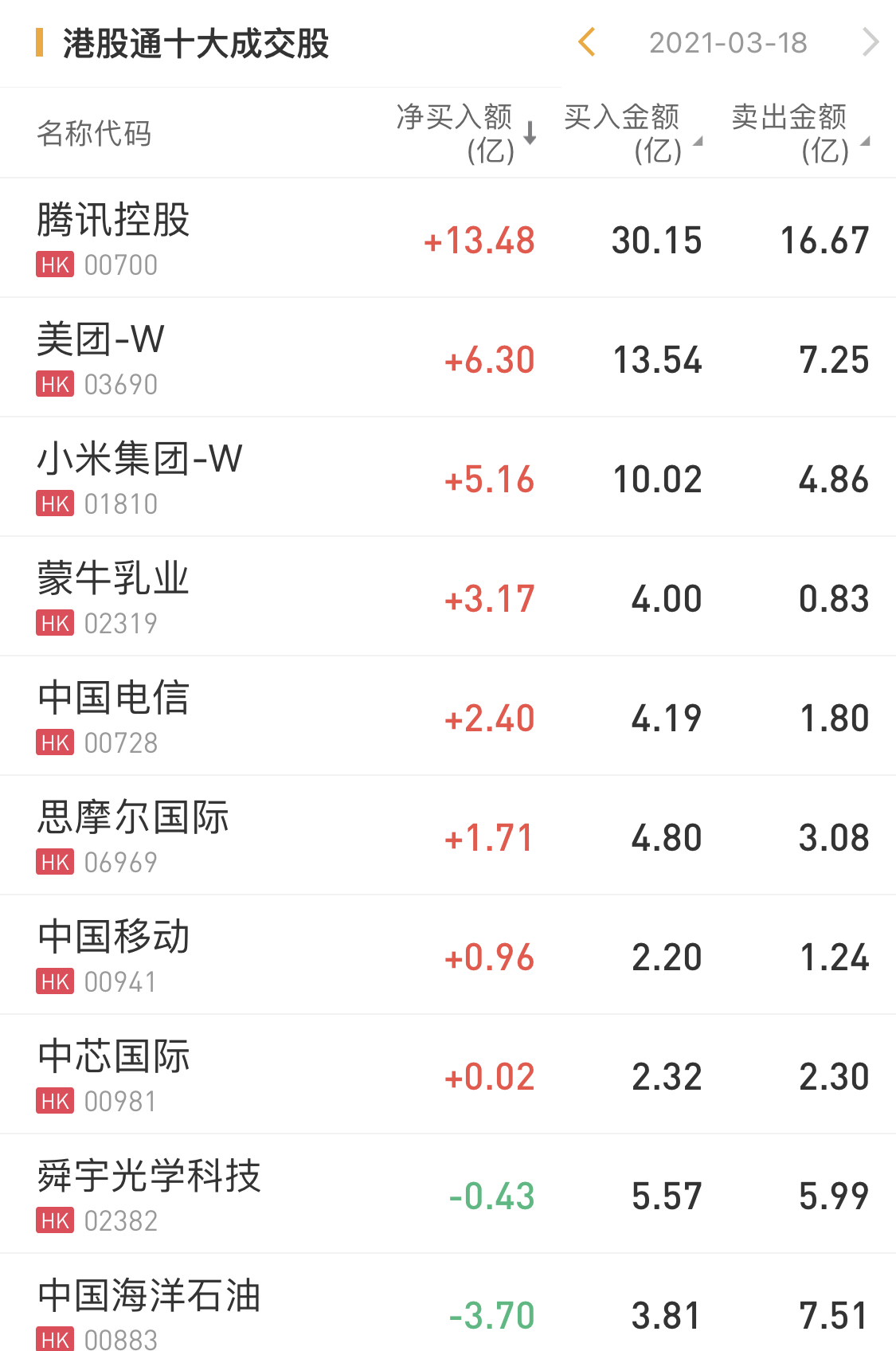 个股方面,今日南下资金连续第三天大幅买入腾讯,净买入达13.48亿港元,为今日买入之最。此前连续遭抛售的美团,重新受到资金追捧,今日获净买入达6.30亿元。
