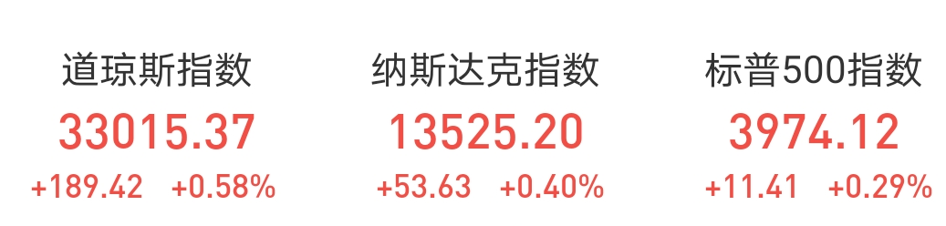 周三收盘,道琼斯指数涨189.42点,涨幅0.58%,报33015.37点;标普500指数涨11.41点,涨幅0.29%,报3974.12点;纳斯达克综合指数涨53.64点,涨幅0.40%,报13525.20点。