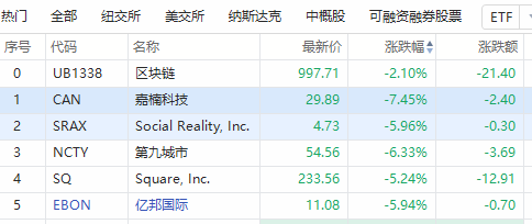 截止发稿,嘉楠科技(CAN)跌超7%,第九城市(NCTY)跌6.33%,亿邦国际(EBON)跌5.94%。