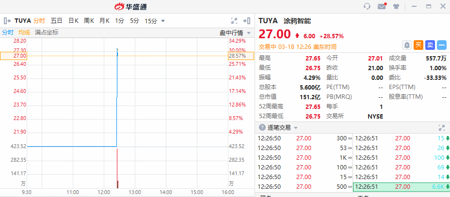 华盛资讯3月18日讯,涂鸦智能今日正式登陆美股,截至发稿,该股涨超28%,报27美元,当前总市值约151亿美元。