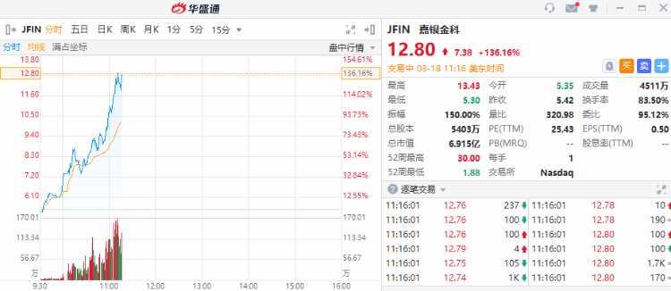 中概股嘉银金科(JFIN)盘中超级拉升,截至发稿,现涨136.16%,报12.8美元,换手率高达83.5%。