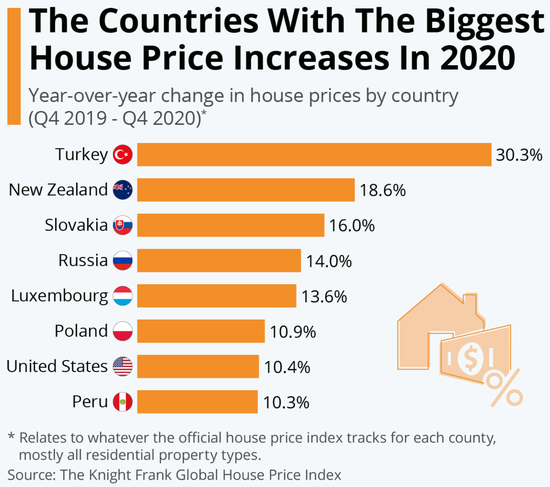 数据显示,几个新兴市场地区的房地产价格增长强劲,其中土耳其连续第四个季度位居该指数榜首。在2019年四季度至2020年四季度期间,土耳其住宅房地产价格涨幅达到了30%。第二大涨幅出现在新西兰,为19%,而斯洛伐克排名第三,涨幅为16%。美国的房价继续保持稳定增长,以10%的涨幅位居榜单第七位。