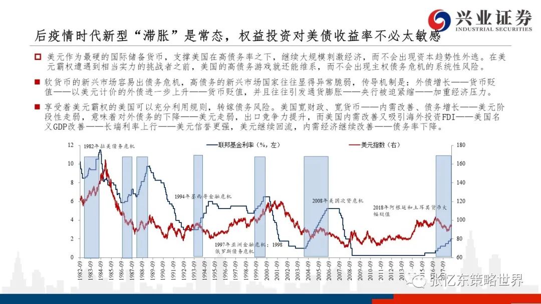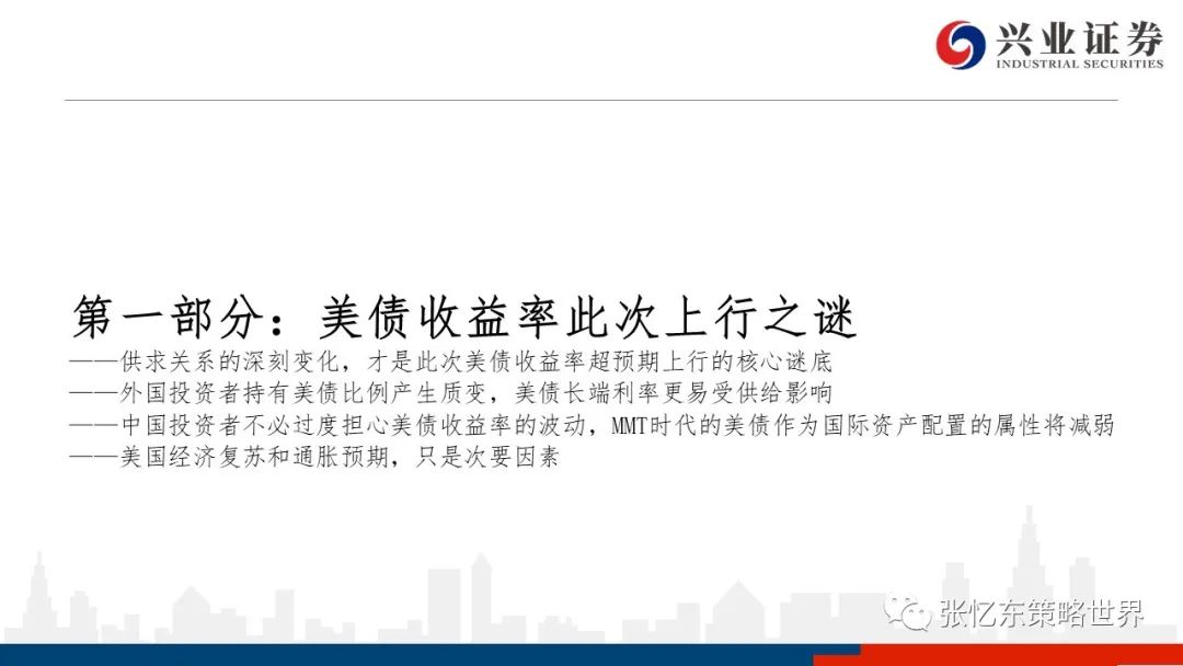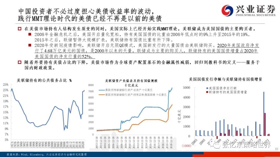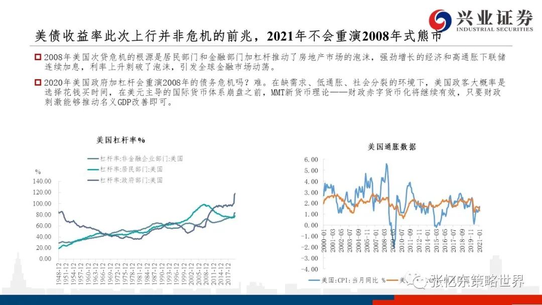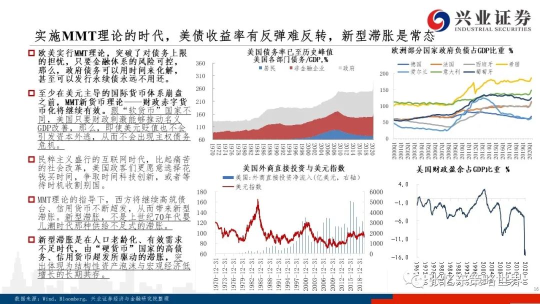 ——中国投资者不必过度担心美债收益率的波动,欧美实行MMT时代的美债作为国际资产配置的属性已经减弱。1)美国开始实践MMT理论,突破了对债务上限的担忧,政府债务可以用时间来化解,权益投资对美债收益率不必太敏感。跟“软货币”国家不同,美国利用美元主导的国际货币体系,保证财政刺激、债台高筑时不会出现美元恶性贬值、资本外逃和主权债务危机。2)实施MMT理论的时代,美债收益率有反弹难反转,新型滞胀是常态,突出体现为结构性资产泡沫与宏观经济低增长的长期共存——不是上世纪70年代婴儿潮时代那种供给不足式的滞胀,而是在人口老龄化、有效需求不足时代,由“硬货币”国家的高债务、信用货币超发所驱动的滞胀。3)传统意义上的通胀不是大问题,美国结构性问题严重,需要用钱买时间来恢复经济竞争力;大国博弈是持久战,当前美国没有足够的意愿和信心挑起金融危机。