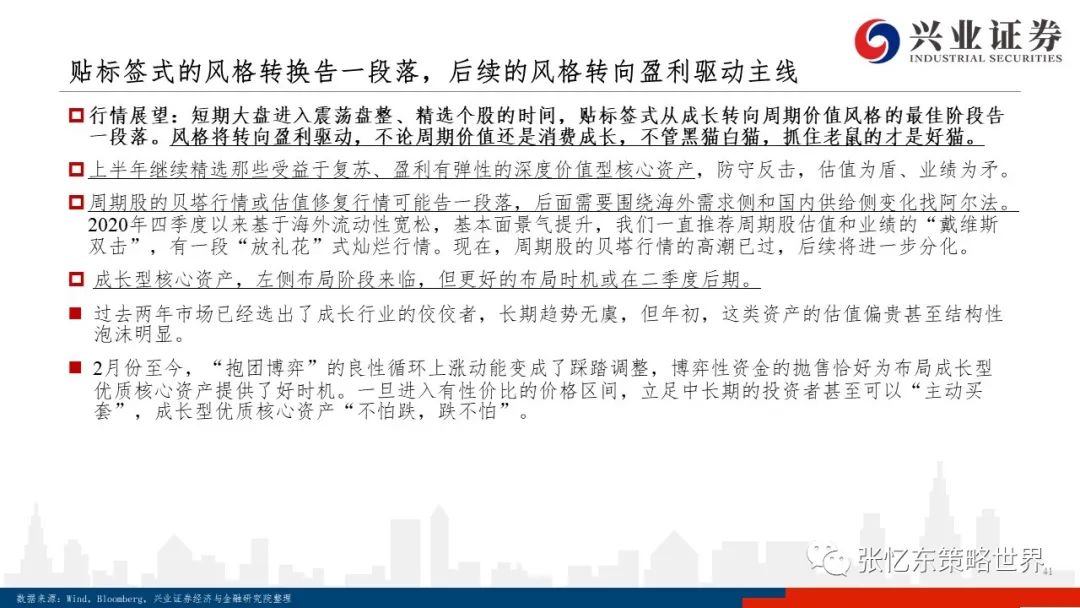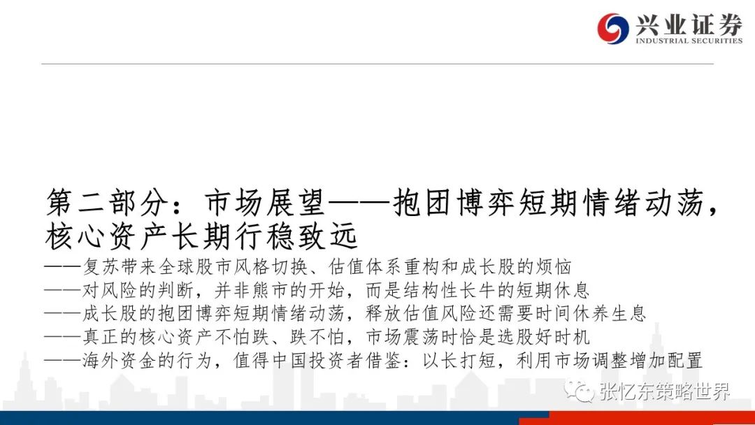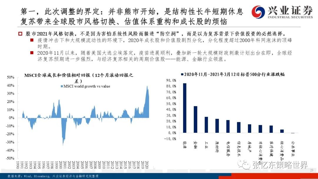 ——第一,此次调整的界定:并非熊市开始,是结构性长牛短期休息。复苏带来全球股市风格切换、估值体系重构和成长股的烦恼。股市2021风格切换,不是躲进“防空洞”的博弈,而是价值投资的必然选择。