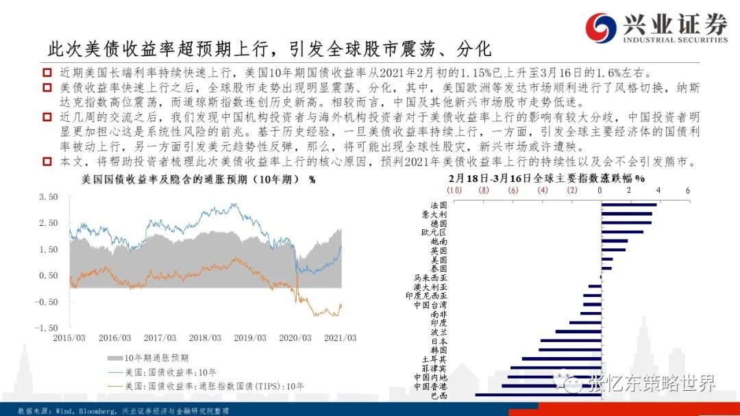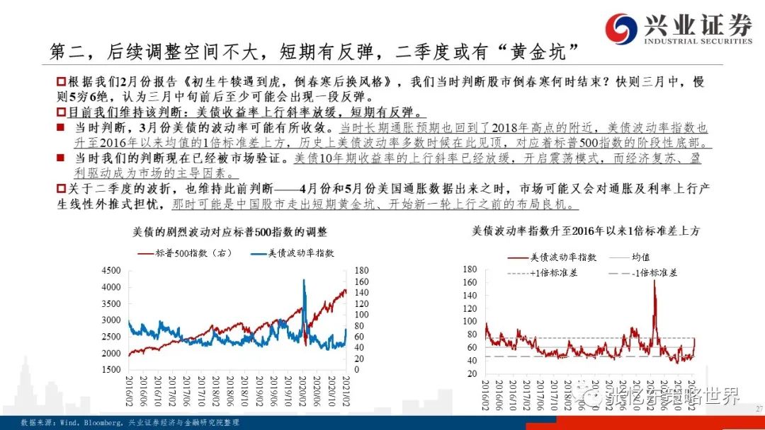 1)3月中旬前后行情进入反弹窗口期,2月份报告《初生牛犊遇到虎,倒春寒后换风格》的判断已经被验证:美债收益率上行斜率放缓,股市倒春寒在3月份中旬前后告一段落,有短期反弹。但是,4月份和5月份美国通胀数据出来之时,市场可能又会对通胀及利率上行产生线性外推式担忧,那时是中国股市走出短期黄金坑、开始新一轮上行之前的布局良机。