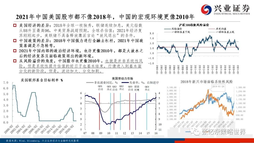 ——美债收益率此次上行并非危机的前兆,2021年不会重演2008年式熊市,也不像2018年,中国的宏观环境更像2010年。类似2010年,今年中国宏观环境也是经济复苏之后面临刺激政策退出的新环境,股市风险溢价也相似,所以,股市并非系统性风险,但是系统性提升估值的好日子也基本结束,行情进入到基本面分化的新阶段,但是波动加大、分化加剧。