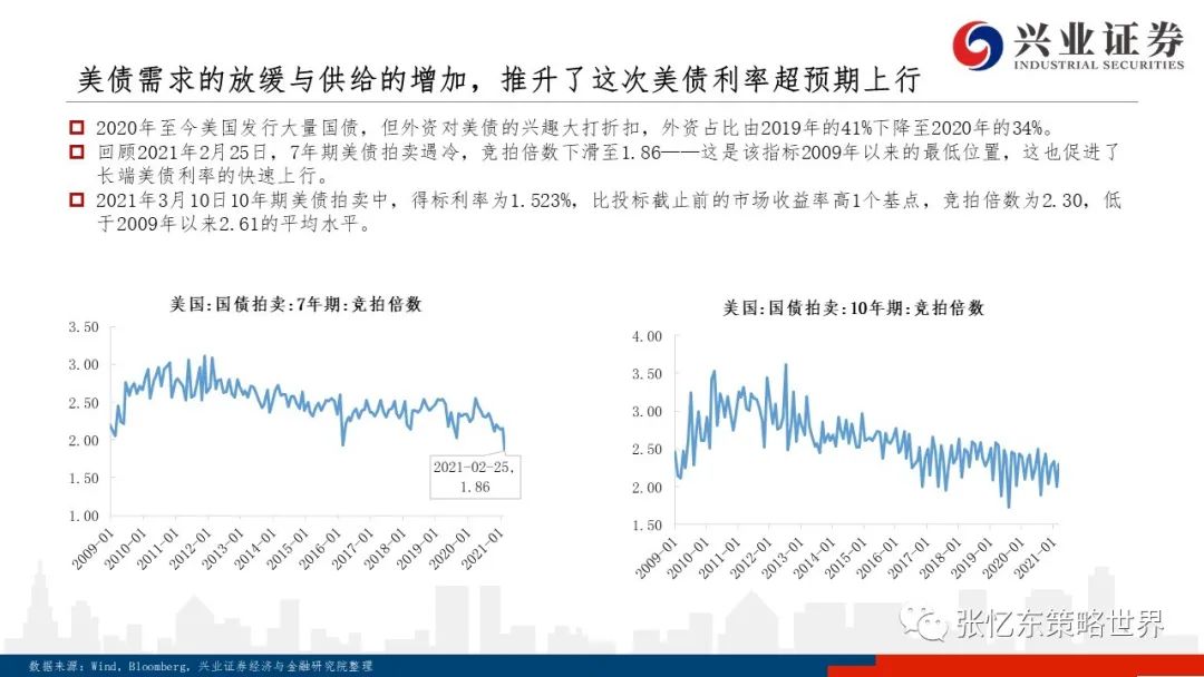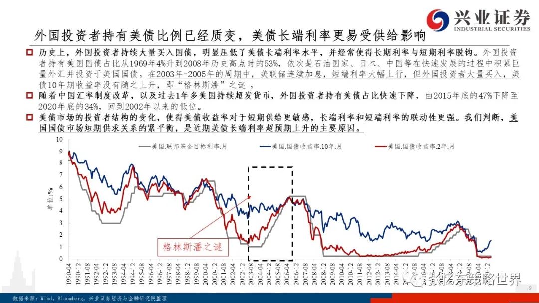 ——外国投资者持有美债比例已经产生质变,美债长端利率更易受供给影响。1)历史上,外国投资者持续大量买入国债,明显压低了美债长端利率水平,并经常使得长期利率与短期利率脱钩,如“格林斯潘”之谜。随着中国汇率制度改革以及过去1年多美国持续超发货币,目前外国投资者持有美债占比快速下降到2002年以来的低位。2)随着美债市场投资者结构的变化,美债市场回归到教科书的定义——服务于国内财政政策,使得美债收益率对于短期供给更敏感。