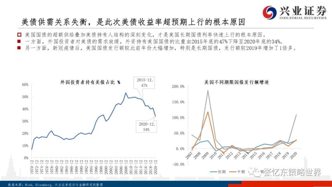 ——美债供求关系的深刻变化,才是此次美债长端利率超预期上行的核心谜底。1)外国投资者对美债的需求放缓,外资持有美国国债的比重由2015年底的47%下降至2020年底的34%。2)新冠疫情后,美国国债发行额较此前年份大幅增加,特别是长期国债,发行额较2019年增加了1倍多。当前市场忽视了美债长端利率上行的结构性问题,市场担心的美国复苏和通胀预期,只是美债收益率上行的次要因素。