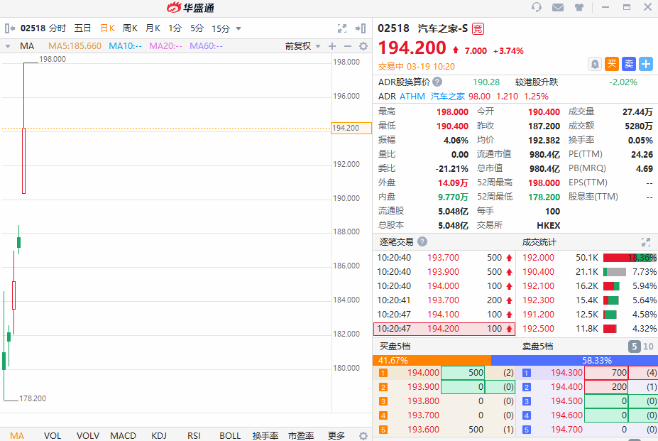 华盛资讯3月19日消息,次新股汽车之家今日跳空高开,盘中又获短线快速拉升,最高见198港元,突破上市以来新高。截至发稿,汽车之家涨幅收窄至3.74%,现报194.2港元每股,暂成交5280万,当前总市值为980.4亿港元。