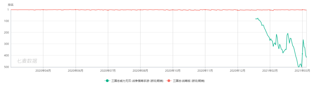 《三国志·战略版》从上线初就几乎未离开过iOS畅销榜TOP10,而《三国志威力无双》目前已经逐渐下滑至300多名。