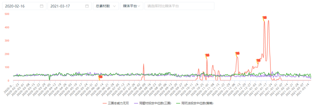 《三国志威力无双》虽然请到了蔡康永为其拍摄买量素材,但买量的投入并不大,投放时长也大概仅有一个季度左右。在游戏上线一个月以后,在iOS畅销榜排名已经从上线的100以内跌出200以外,而此时游戏便已经几乎暂停了买量素材的投放。