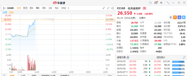 佳兆业美好(02168)公布2020年业绩,总收益同比增加约37.1%至约人民币17.3亿元;公司拥有人应占溢利同比增加35.4%至2.22亿元。该股早盘急升,截至发稿,涨19.59%,报26.55港元,成交额5374万港元。