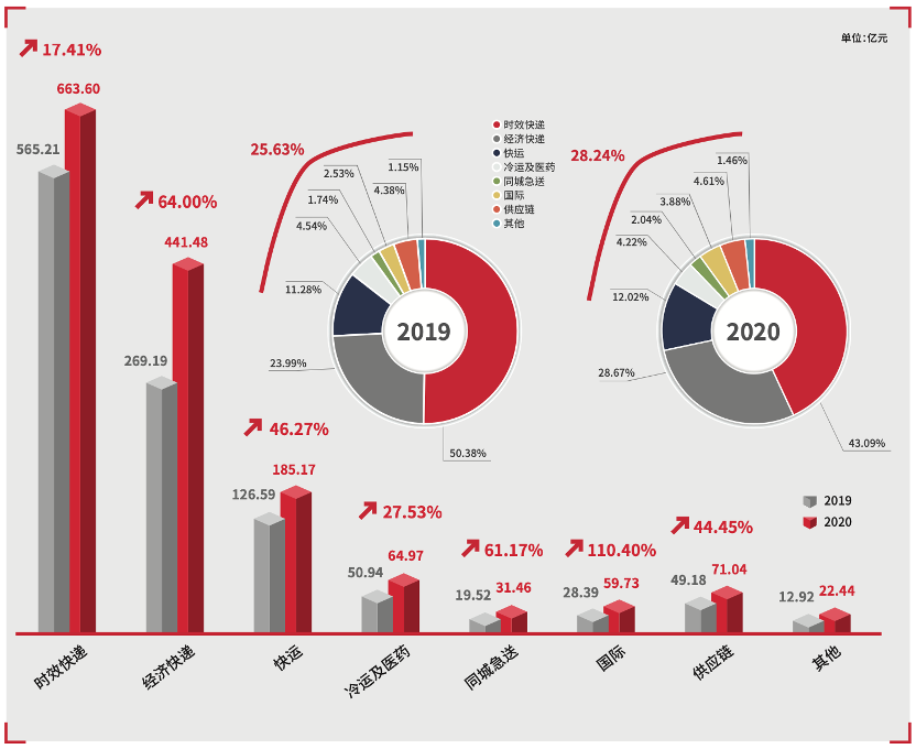 顺丰方面,疫情影响下,顺丰快速抢占时效快递、特惠专配等电商件市场份额。财报显示,顺丰去年完成业务量81.37亿件,同比增长68.5%,增速继续领跑行业。值得一提的是,以特惠专配为主的经济件全年业务量增速高达155.86%,助推整体市场份额提升至9.76%,较2019年增加了2.16个百分点。