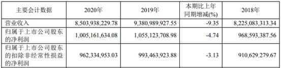 3月18日晚间, 华润双鹤 发布了2020年度业绩报告。根据公告显示,报告期内公司实现营收85.04亿元,同比下滑9.35%;净利润10.05亿元,同比微降4.74%;扣非净利润9.62亿元,同比减少3.13%。