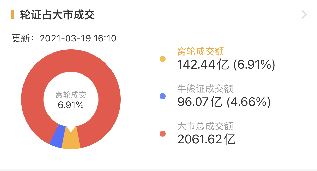 其中,窝轮总成交142.44亿港元,牛熊证总成交96.07亿港元。