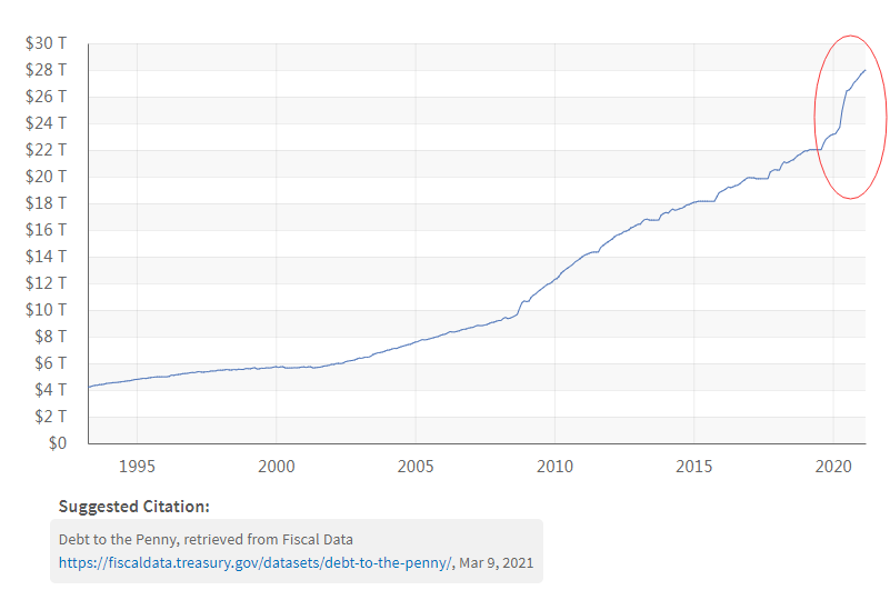 叠加去年3月特朗普政府的2.2万亿美元CARES法案,以及去年12月追加的9000亿美元财政刺激,短短一年内,美国政府的财政刺激措施规模就达到5万亿美元。