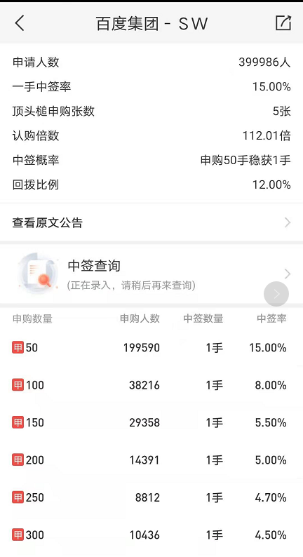 百度集团-SW超购约112.01倍,申购50手稳中一手,中签率为15%,乙头获配7手