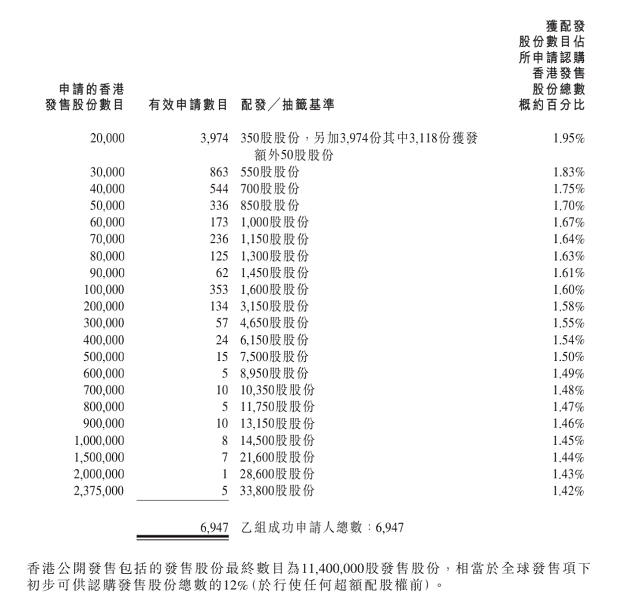 合共13名承配人获配发5手或以下发售股份,相当于国际发售307名承配人中约4.2%。该等承配人获配发根据国际发售初步可供认购发售股份的0.0020%。合共11名承配人获配发4手或以下发售股份,相当于国际发售307名承配人中约3.6%。该等承配人获配发根据国际发售初步可供认购发售股份的0.0014%。合共5名承配人获配发1手发售股份,相当于国际发售307名承配人中约1.6%。该等承配人获配发根据国际发售初步可供认购发售股份的0.0003%。