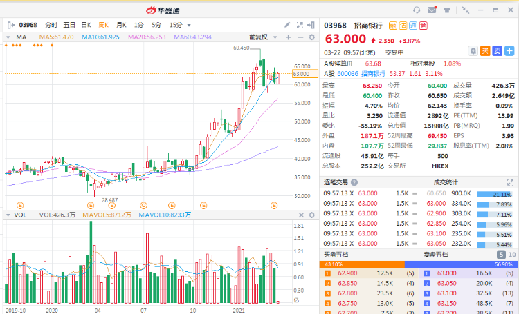 招商银行(03968.HK)涨3.87%,报63港元;招商银行(600036.SH)亦涨逾3%,报53.37元。