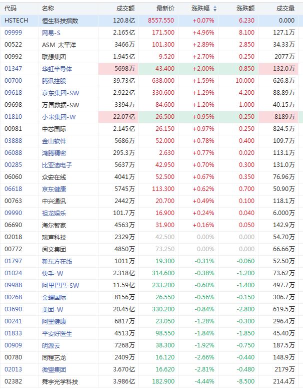 华盛资讯3月22日消息,恒生科技指数早盘低开高走,盘中转涨。现上涨0.07%,报85557点。截至发稿,网易涨4.96%,腾讯涨1.59%,京东涨1.29%,小米涨0.95%,快手跌0.38%。部分芯片股走强,ASM太平洋涨2.89%,华虹半导体涨2%。