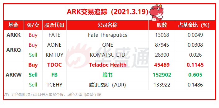 2.继续买入Teladoc约4.5万股,斥资约853.6万美元。女股神一直看好这家远程医疗股,三月初以来股价持续下跌,趁着这个机会,Cathie Wood对Teladoc持续买入。