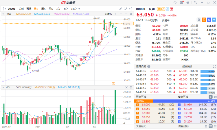 长和(0001.HK)股价反弹回升,现报63.05港元,涨幅4.47%,最新总市值2431亿港元。