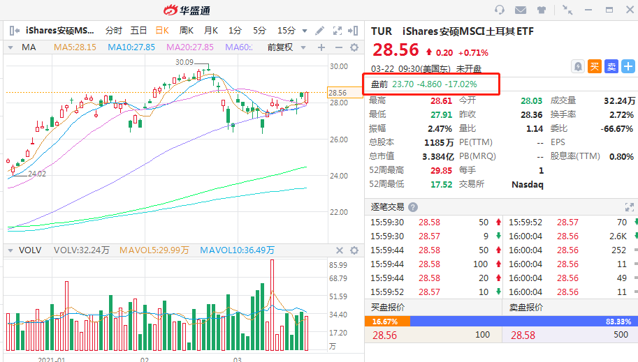 土耳其央行行长Agbal因加息过猛被免职,周一土耳其金融市场巨震,股汇债均出现暴跌。其中土耳其伊斯坦布尔100指数跌7%,再次触发熔断。伊斯坦布尔证券交易所表示,整个市场的熔断机制已经触发。股票市场、衍生品市场的股票和股票指数合约以及债务证券股票回购市场的交易暂停。截至北京时间19:04,安硕MSCI土耳其ETF(TUR)美股盘前大跌超17%。