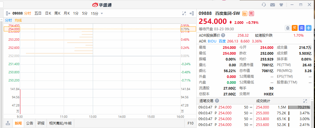 华盛资讯3月23日消息,百度集团-SW(09888)今日首挂高开0.79%,报价254.00港元,每手账面盈利100港币,成交额达5.503亿港元,最新市值达7061亿港元。