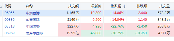 港股烟草概念大幅分化,截至发稿,中烟香港(06055)涨14.06%;华宝国际(00336)涨14.06%;中国波顿(03318)跌22.76%;思摩尔国际(06969)跌30.25%。