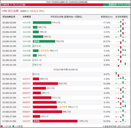 街货分布方面,至周一,恒指牛证街货重货区在收回价27800点至28300点之间,累计相当约4264张期指合约;恒指熊证街货重货区在收回价29600点至30100点之间,累计相当约2037张期指合约。