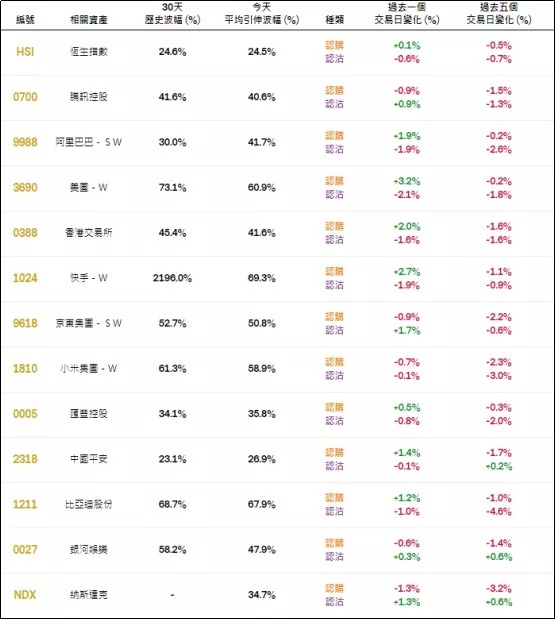 周一恒指相关权证的平均引伸波幅约24.5%,按日继续调升。个股方面,阿里、美团、港交所、快手、平安等相关认购证的引申波幅按日显著调升;相反,腾讯及纳斯达克相关认购证的引申波幅则有所调降。