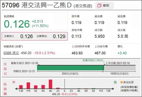 1、强势轮证:港交法兴一乙熊(57096.HK),周一上涨11.5%;