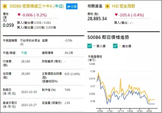2、看错方向:恒指瑞通三十牛(50086.HK),周一下跌9.2%。