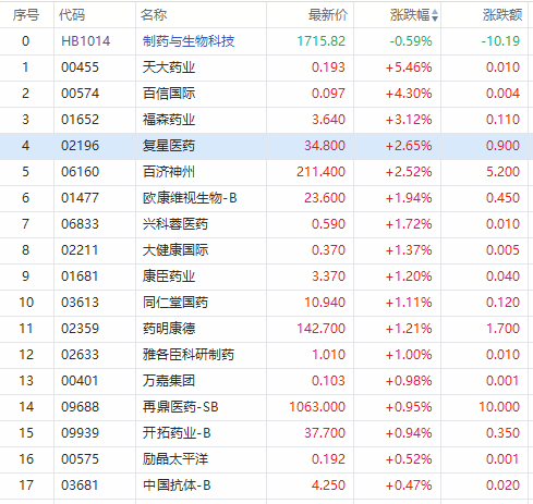 华盛资讯3月22日消息,生物医药股今日集体上涨。截止发稿,天大药业涨超5%,百信国际涨超4%,百济神州涨超3%,复星医药涨超2%,药明康德涨超1%。