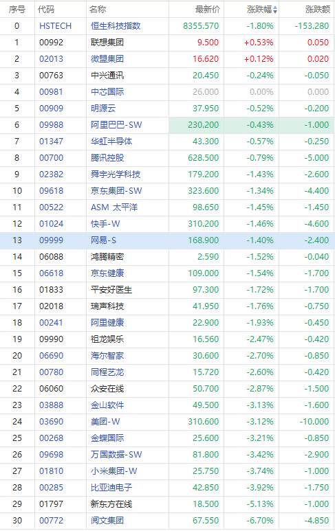 华盛资讯3月23日消息,恒生科技指数今日高开低走,现下跌1.8%,报8355.57点。截至发稿,联想集团、微盟集团逆市微涨,其余成分股普跌。腾讯跌0.79%、阿里跌0.43%、京东跌1.34%、快手跌1.46%、美团跌3.12%、小米跌3.74%。