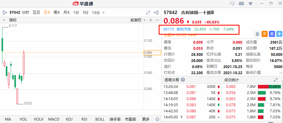 其熊证大涨。截至发稿,吉利瑞银一十熊B大涨超68%,其行使价为26.5港元,2021年10月25日到期,杠杆比率5.21倍,距收回价有16.07%的回收距离。