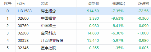 华盛资讯3月23日消息,稀土概念板块集体跳水。截止发稿,中国铝业跌超9%,中国稀土跌超8%,金风科技跌超6%,江西铜业股份跌超5%。