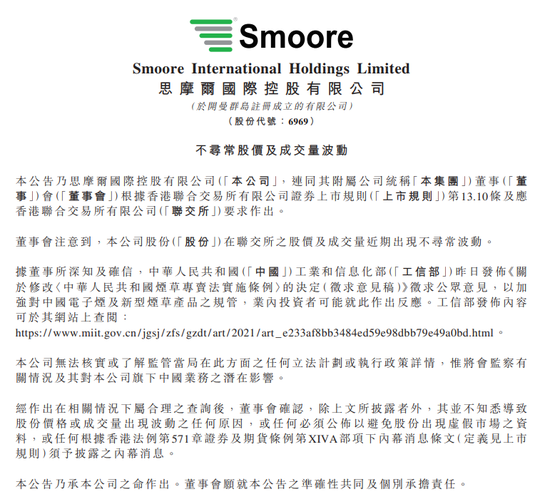 3月23日消息,思摩尔国际:据董事所深知及确信,中华人民共和国工业和信息化部昨日发布《关于修改〈中华人民共和国烟草专卖法实施条例〉的决定》徵求公众意见,以加强对中国电子烟及新型烟草产品之规管,业内投资者可能就此作出反应。本公司无法核实或了解监管当局在此方面之任何立法计划或执行政策详情,惟将会监察有关情况及其对本公司旗下中国业务之潜在影响。