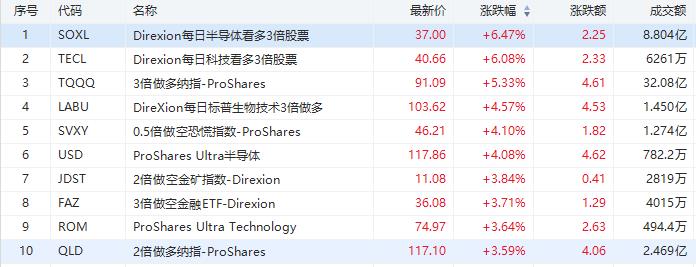 美股周一收高,科技股领涨。随着美债收益率回落,投资者重新追捧科技股。从ETF涨幅榜来看,涨幅居前主要的ETF主要于看多科技ETF的相关,其中一只每日半导体看多3倍股票的SOXL大涨6.47%,成交额8.8亿美元;每日科技看多3倍股票的TECL涨6.08%%,成交额6261万美元。