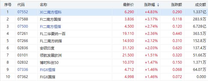 今日港股三大指数高开低走,港股涨幅居前的ETF主要全部都是做空指数的相关,其中南方两倍做空恒科涨4.83%,成交额1.34亿港元;南方两倍看空国指涨3.17%。