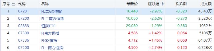 看空恒指相关ETF走强,其中南方两倍看空恒指(07500.HK)涨2.74%,成交额6.73亿港元。