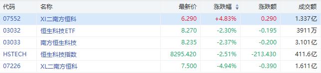 今日恒生科技指数跌2.51%。其中,南方两倍做多恒科(07226.HK)跌4.94%,成交额1.61亿港元;南方两倍做空恒科涨4.83%,成交额1.34亿港元。
