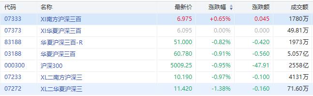 沪深300指数跌0.95%。其中,南方做空沪深三百ETF涨0.65%,成交额1870万港元;南方两倍做多沪深三百ETF跌0.97%,成交额4131万港元。