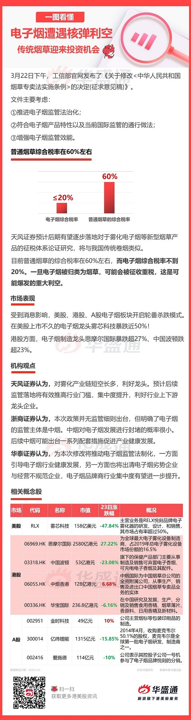 天风证券认为,对雾化产业链短空长多,利好龙头。预计后续监管落地将有效推高行业门槛,集中度提升,利好行业上下游龙头企业。